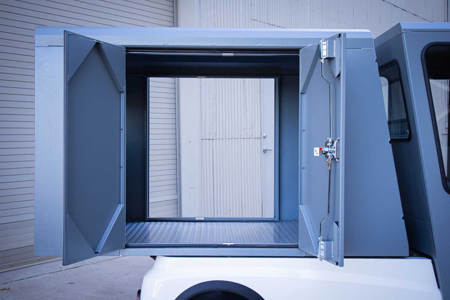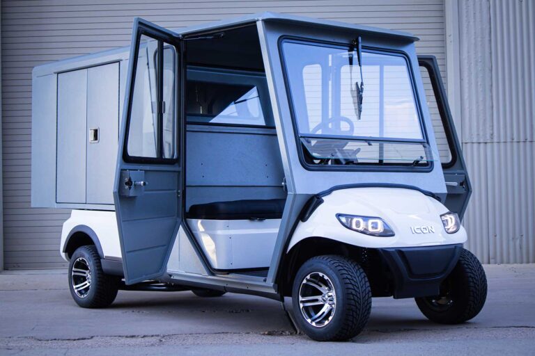 Our electric utility vehicle lineup offers endless possibilities! The ICON C20V commercial golf cart is equipped with an enclosed aluminum locking van box featuring side and rear doors for easy access and enhanced security. This spacious 6′ van box is perfect for securely transporting medical supplies, hotel essentials, and more. The C20V comes standard with maintenance-free AGM batteries, 10′′ aluminum wheels, 4-wheel disc brakes, a horn, a full light package, and a